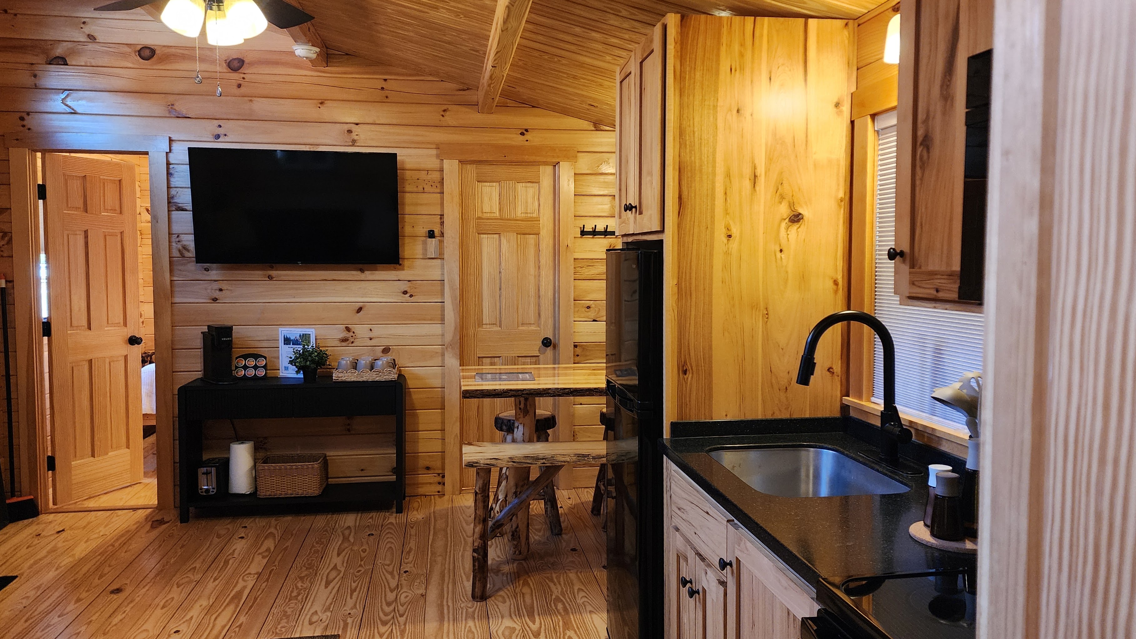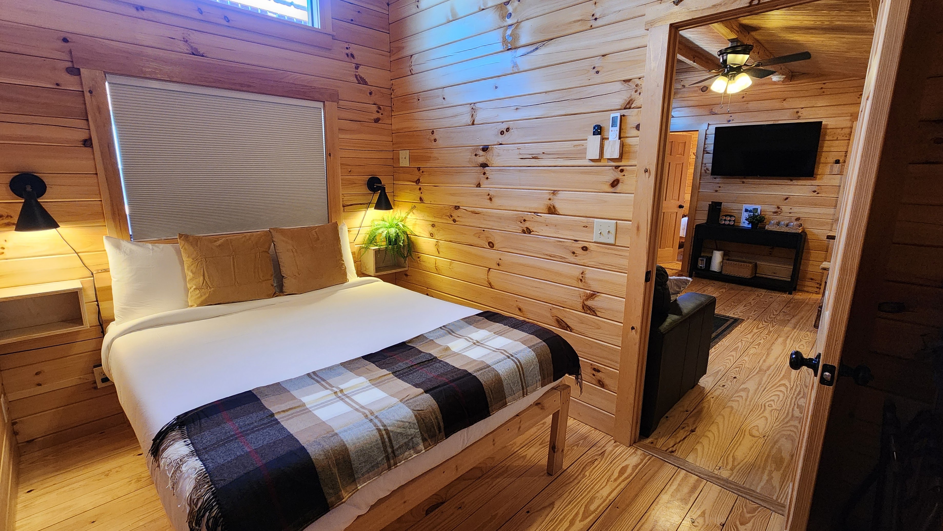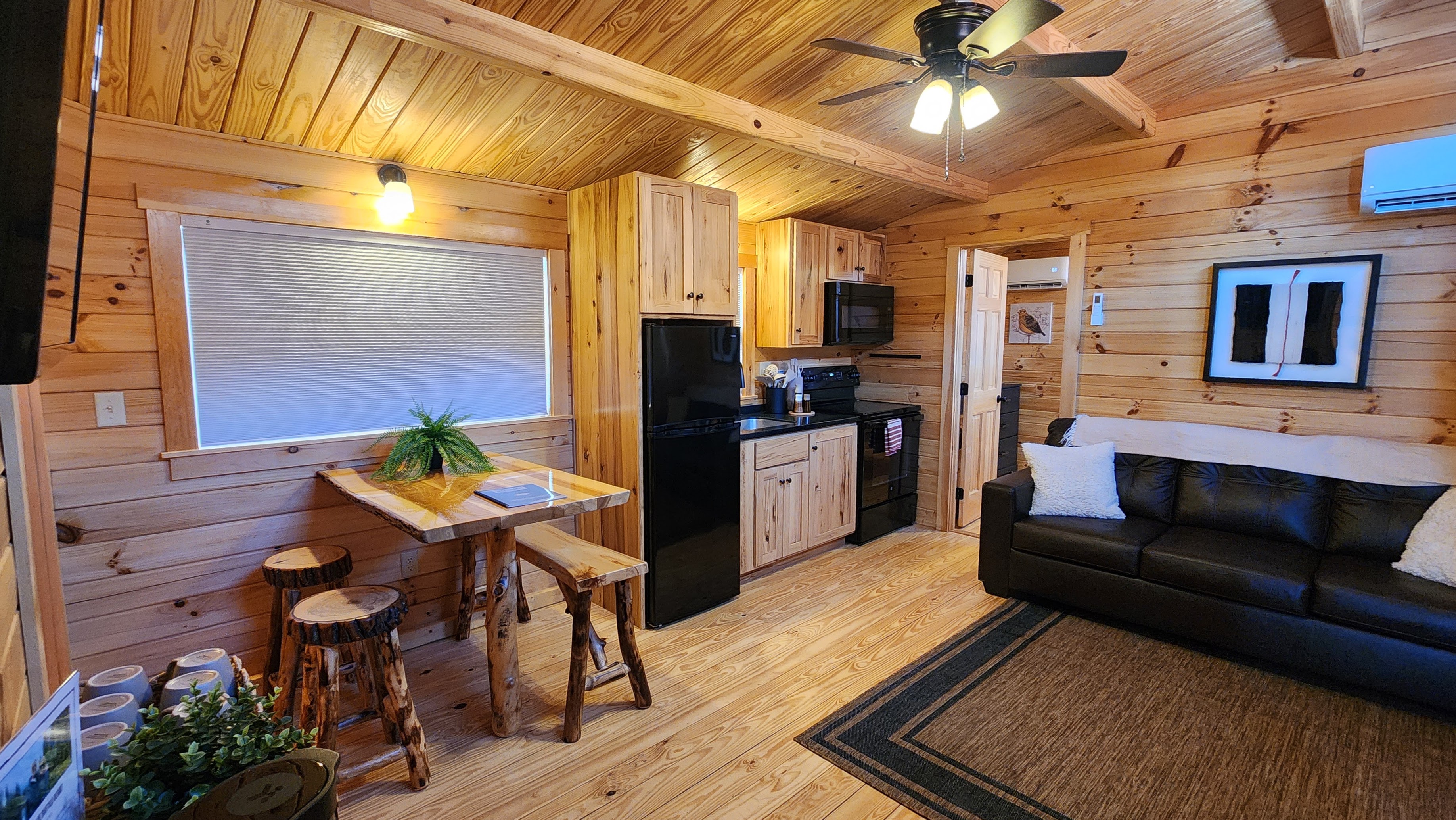Escape to the Fir Cabin—a comfortable retreat that sleeps up to 6 guests with 2 bedrooms, 2 beds, 1 Sofa Sleeper, and 1 bathroom. You'll find a 1 private Queen bedroom, 1 private double bedroom, and a queen sleeper sofa in the living room—ideal for families or small groups. Prepare meals in the fully equipped kitchen with full-sized appliances and rustic wood dining furniture, then relax in the living area with a leather sofa, fast Wi-Fi, and two large smart TVs. After a day of exploring, unwind on the front porch deck and take in the peaceful surroundings. Enhance your stay with thoughtful resort amenities. Enjoy a complimentary continental breakfast each morning, relax and recharge in the newly opened resort sauna, and make the most of your downtime with board games and lawn games available for checkout at the front desk. Whether you're unwinding solo, with friends, or with loved ones, these extras help make your stay even more memorable.