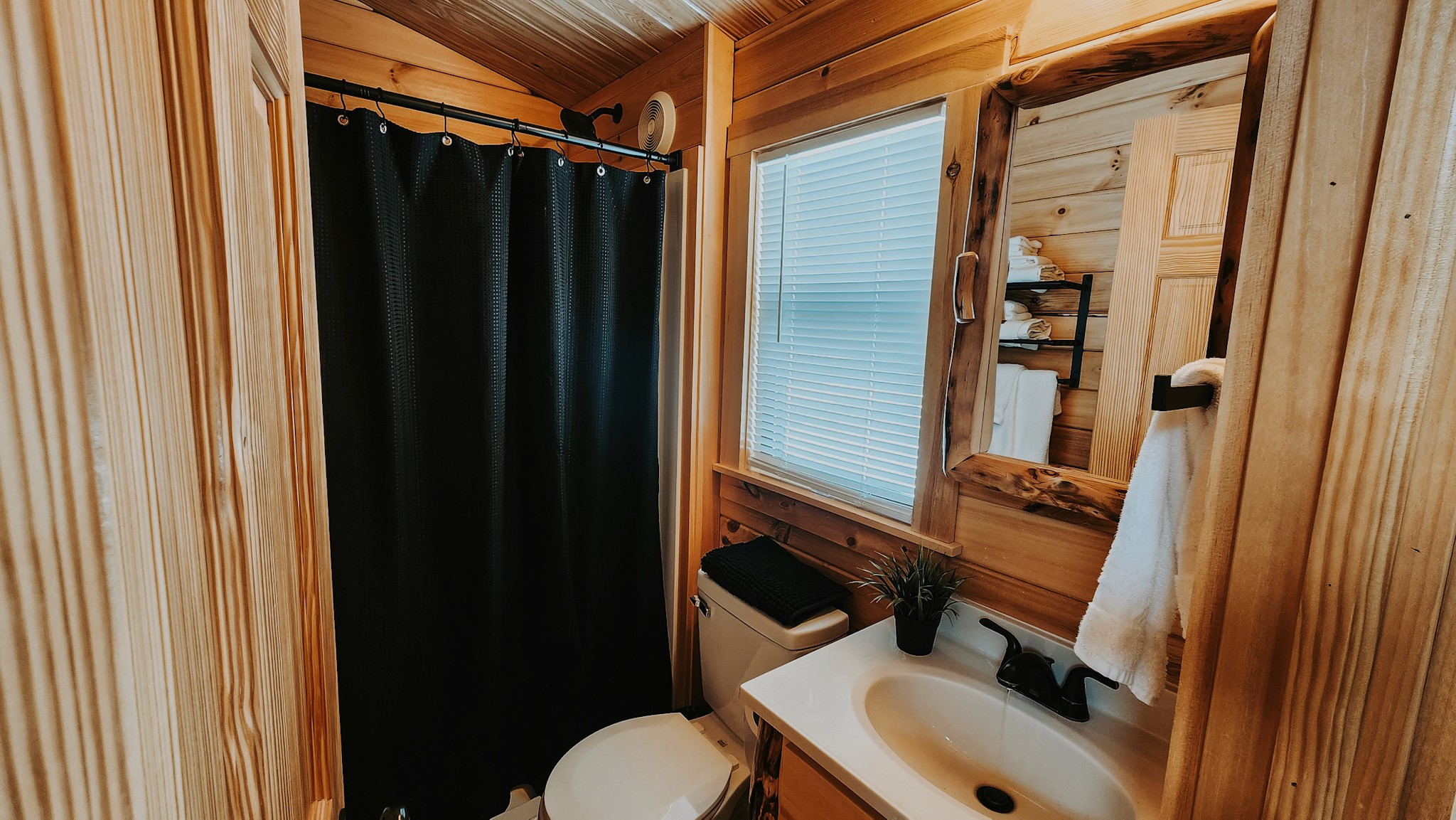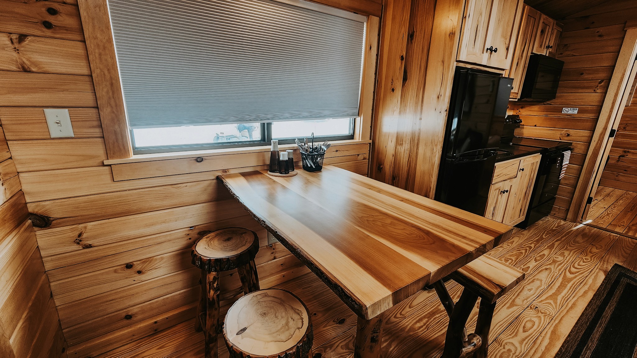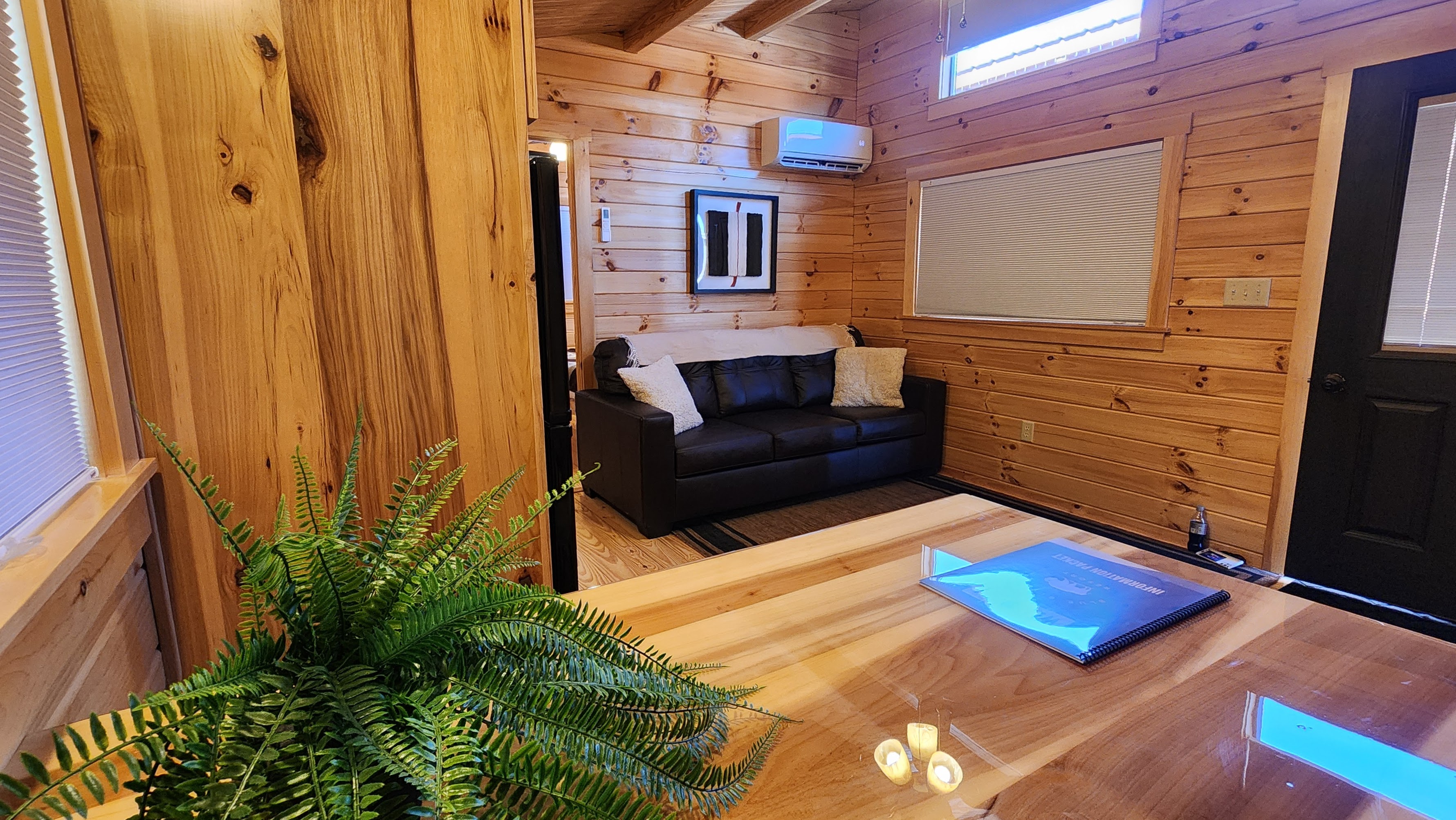 Escape to the Fir Cabin—a comfortable retreat that sleeps up to 6 guests with 2 bedrooms, 2 beds, 1 Sofa Sleeper, and 1 bathroom. You'll find a 1 private Queen bedroom, 1 private double bedroom, and a queen sleeper sofa in the living room—ideal for families or small groups. Prepare meals in the fully equipped kitchen with full-sized appliances and rustic wood dining furniture, then relax in the living area with a leather sofa, fast Wi-Fi, and two large smart TVs. After a day of exploring, unwind on the front porch deck and take in the peaceful surroundings. Enhance your stay with thoughtful resort amenities. Enjoy a complimentary continental breakfast each morning, relax and recharge in the newly opened resort sauna, and make the most of your downtime with board games and lawn games available for checkout at the front desk. Whether you're unwinding solo, with friends, or with loved ones, these extras help make your stay even more memorable.
