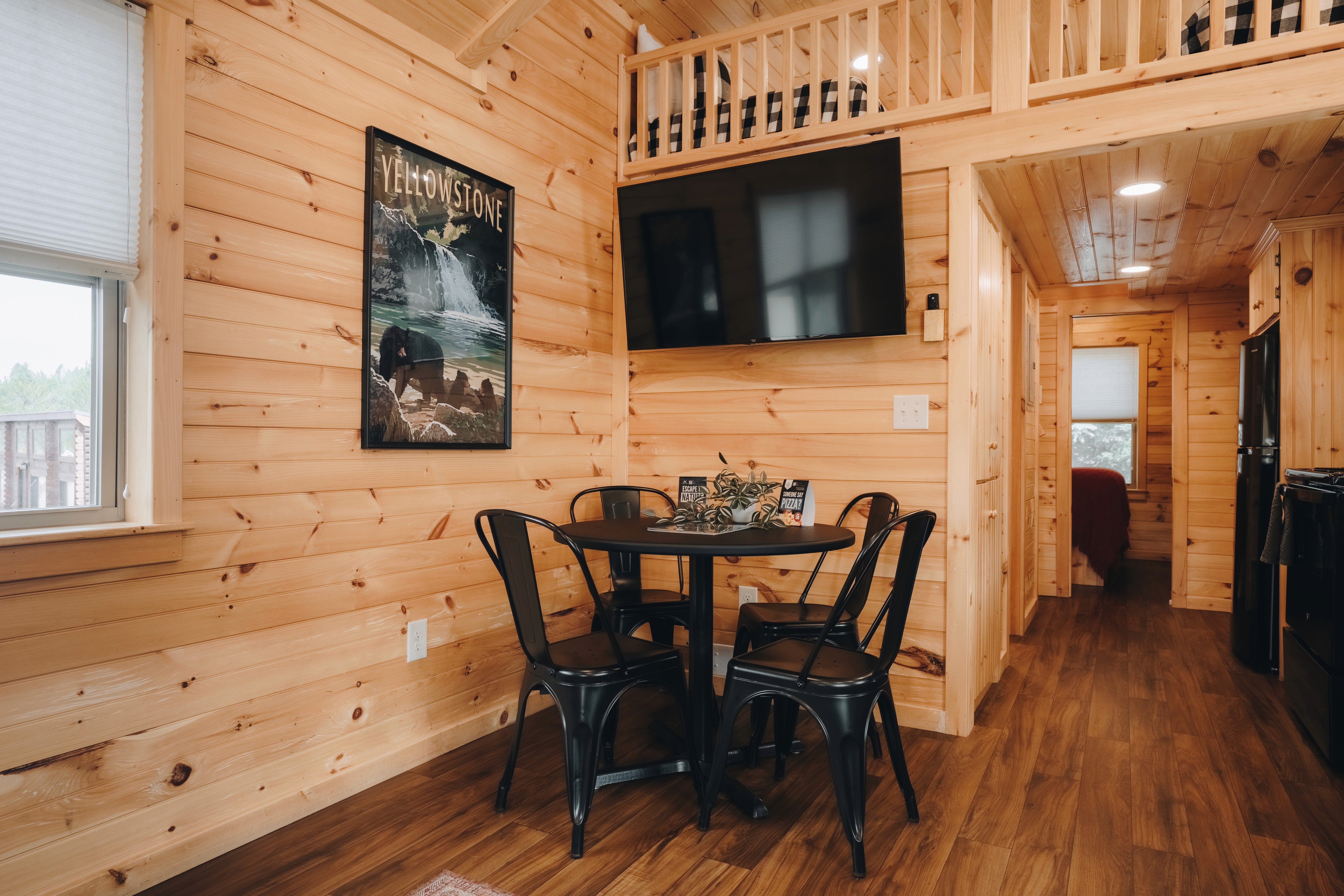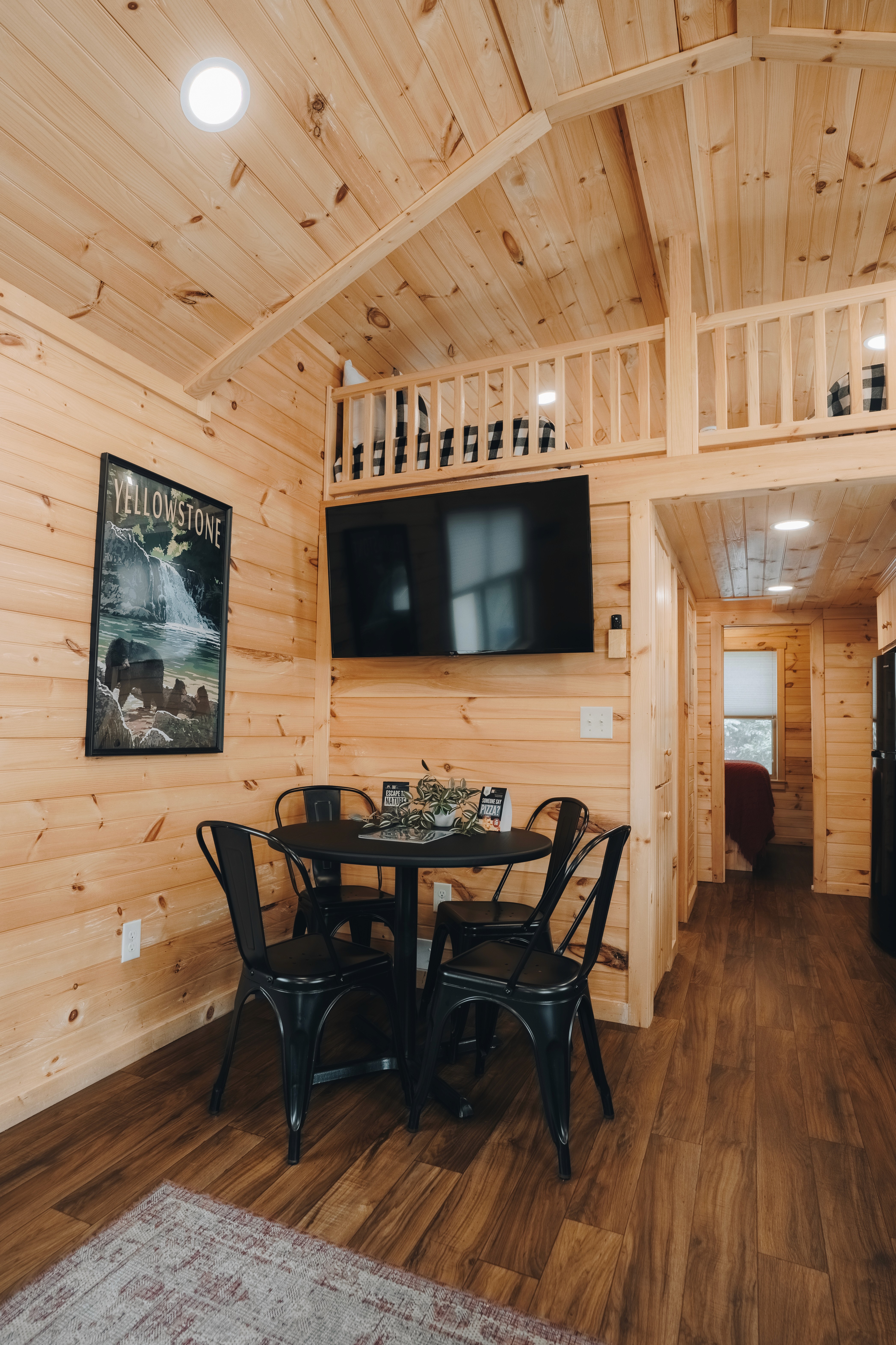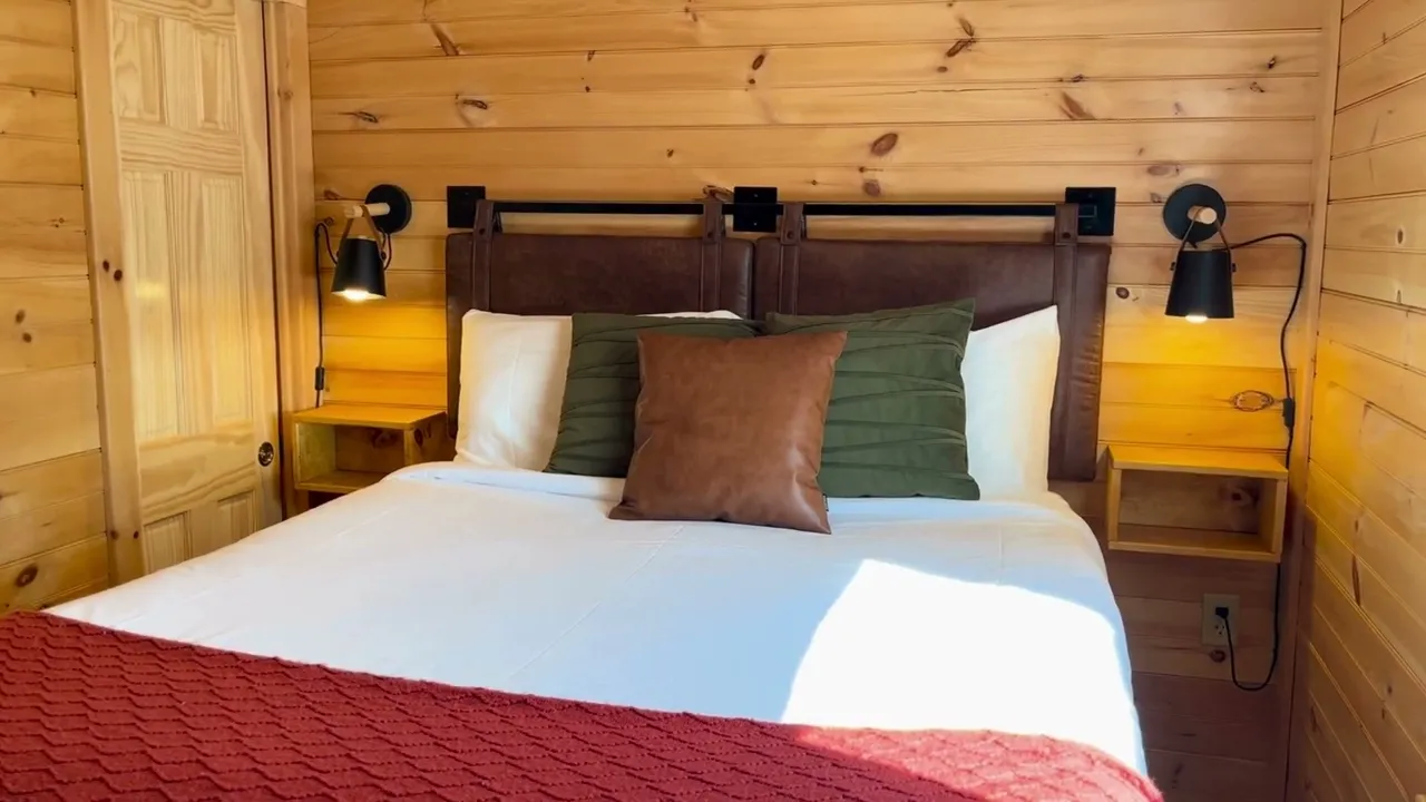 Escape to the Spruce Cabin—a cosy retreat for up to 6 guests with 1 bedroom, 4 beds, and 1 bathroom. Enjoy a fully equipped kitchen, smart TVs, fast Wi-Fi, and a covered porch with rocking chairs. Resort perks include free continental breakfast, a new sauna, and games to borrow. Cabins