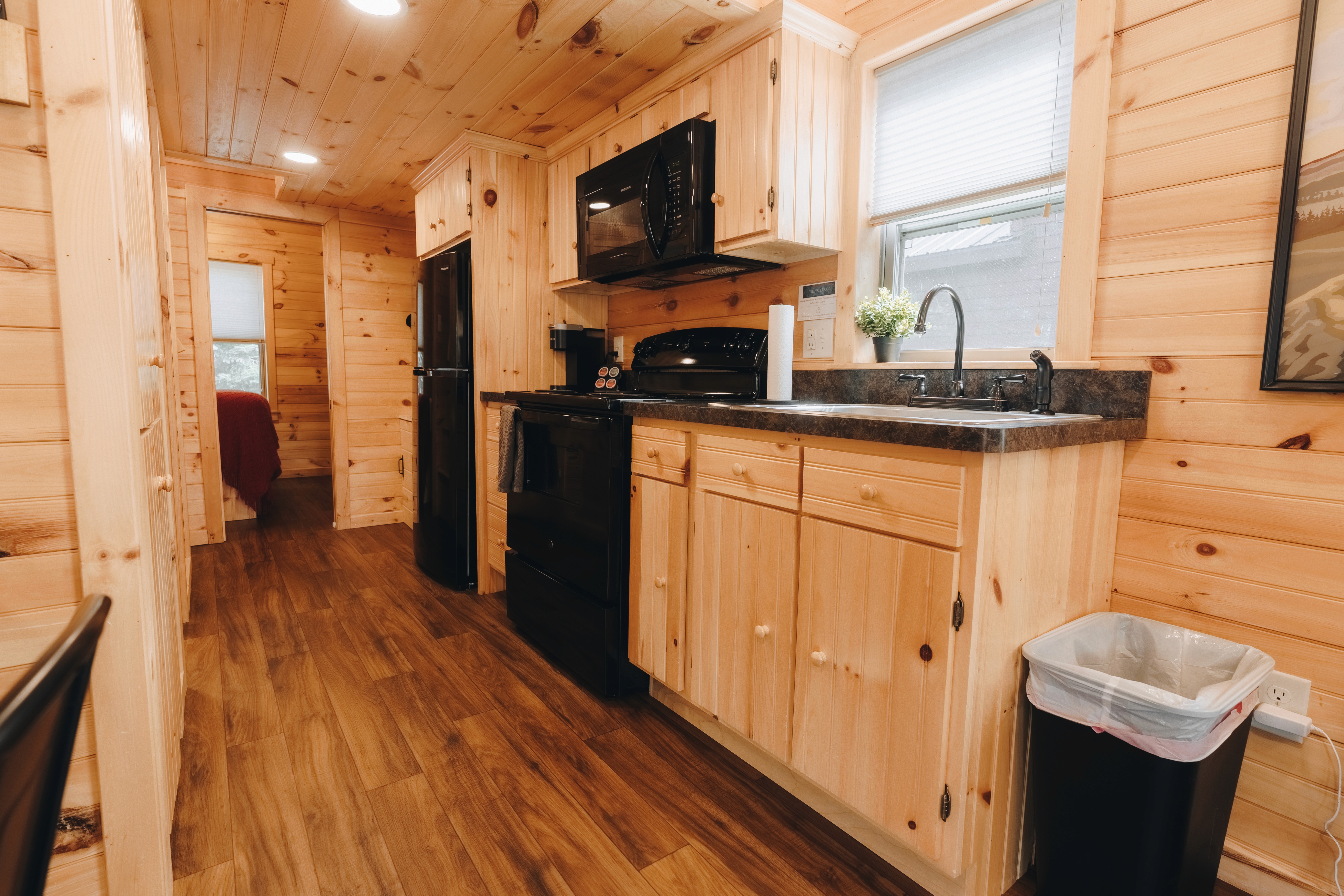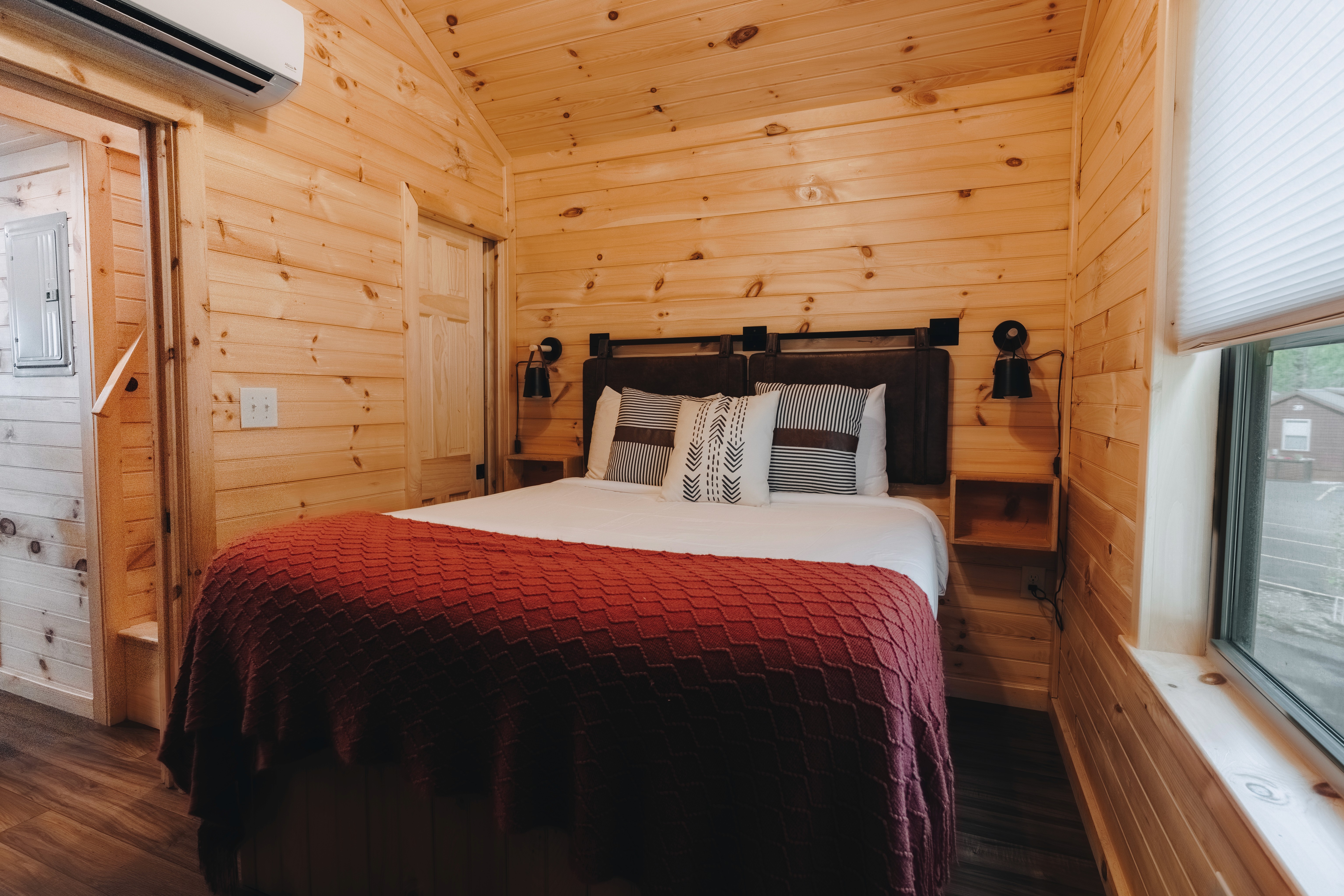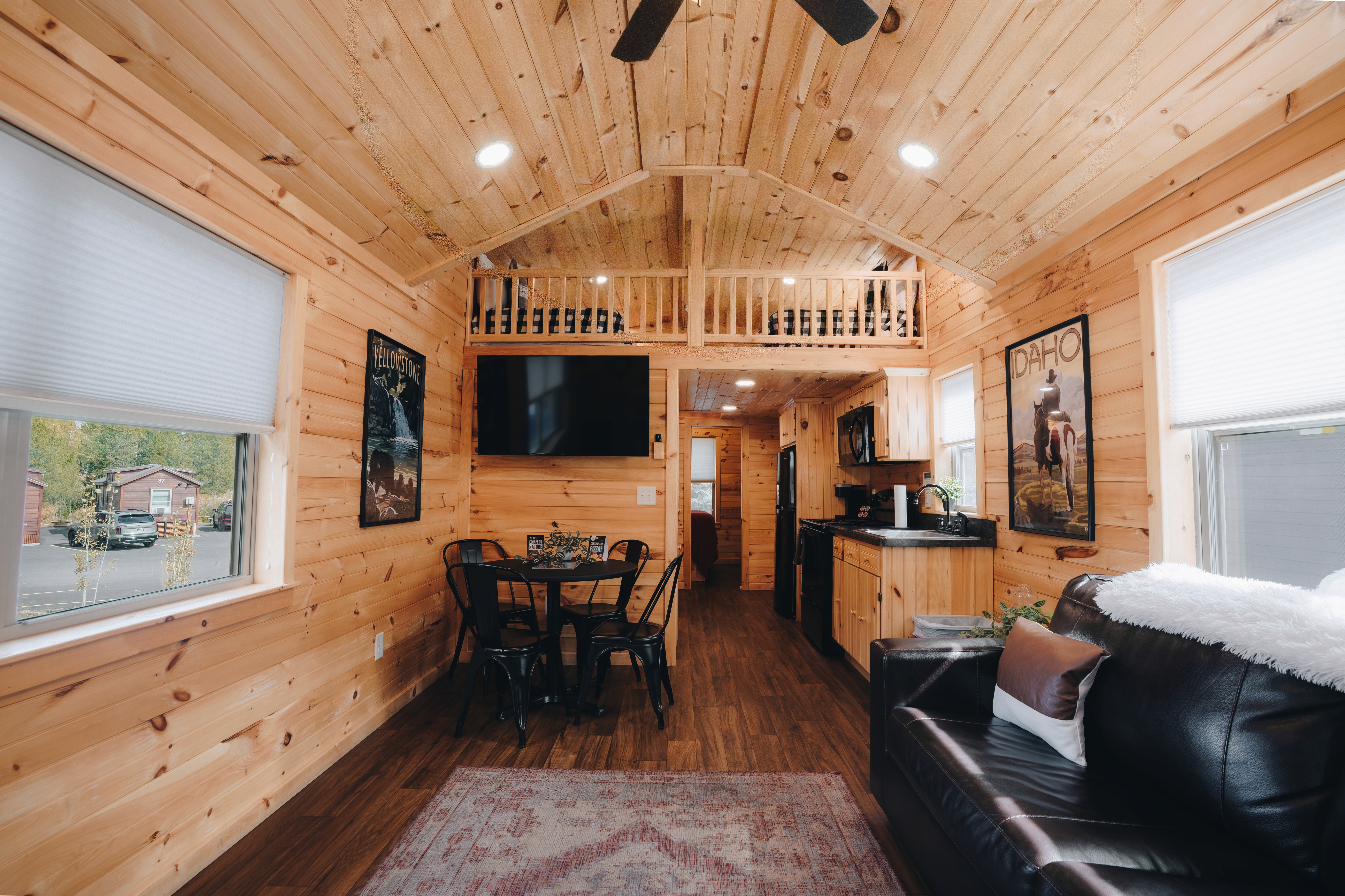 Escape to the Spruce Cabin—a cosy retreat for up to 6 guests with 1 bedroom, 4 beds, and 1 bathroom. Enjoy a fully equipped kitchen, smart TVs, fast Wi-Fi, and a covered porch with rocking chairs. Resort perks include free continental breakfast, a new sauna, and games to borrow. Cabins