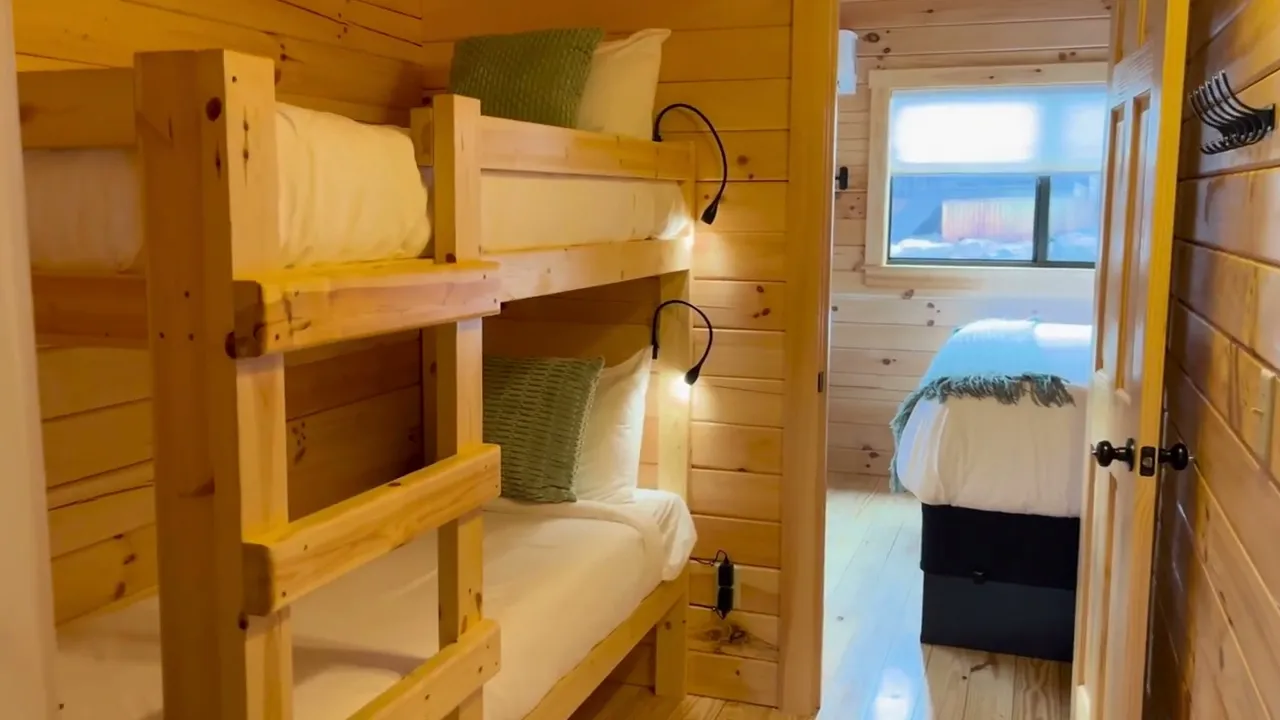 Escape to the Willow Cabin—a welcoming retreat that sleeps up to 6 guests with 1 bedroom, 4 beds, and 1 bathroom. You'll find a private queen bedroom, a twin bunk bed in a cozy open alcove, and a queen sleeper sofa in the living room—ideal for families or small groups. Prepare meals in the fully equipped kitchen with full-sized appliances and rustic wood dining furniture, then relax in the living area with a leather sofa, fast Wi-Fi, and two large smart TVs. After a day of exploring, unwind on the covered front porch in the rocking chairs and take in the peaceful surroundings. Cabins