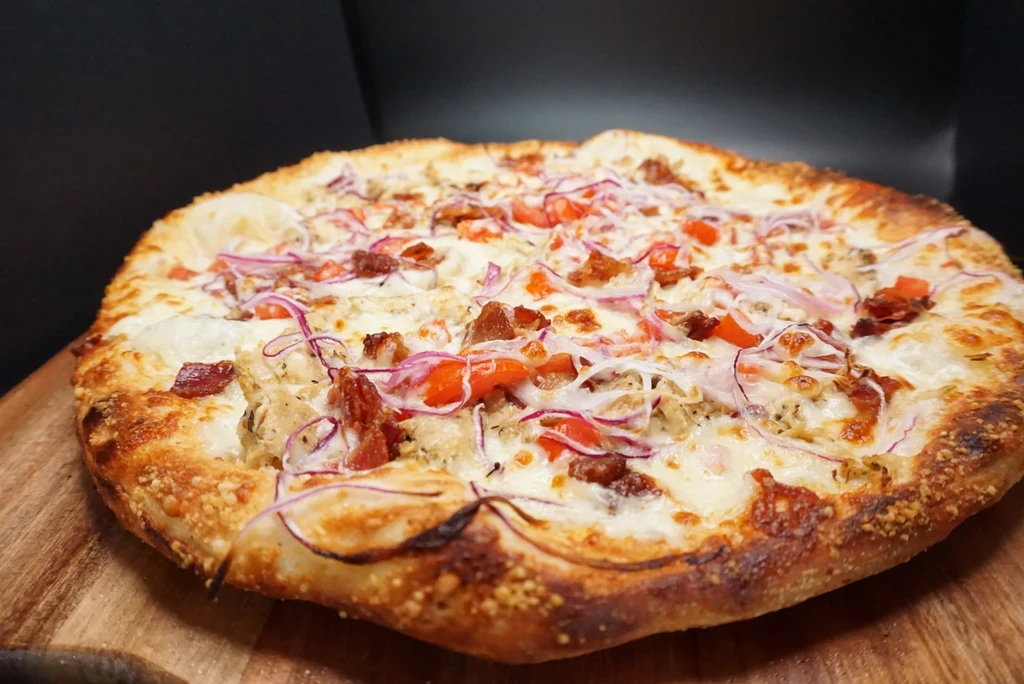 Homemade Ranch, House Cheese Blend, Chicken, Bacon, Onion, Tomato.